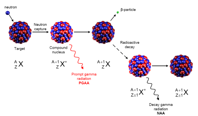 Neutrons have no charge; thus they can interact with the atomic nuclei at any energy. Several neutron-induced nuclear reactions are used for chemical analysis, as they produce gamma radiation or charged particles. These radiations are characteristic, i.e. their energies identify the emitter nuclide and their intensities are proportional to the amount of the nuclide. Slow (cold and thermal) neutrons have the highest cross sections for being captured in atomic nuclei, hence this is the most important reaction used in nuclear analytics. Whenever a nucleus absorbs a neutron, its binding energy is released typically in the form of prompt gamma radiation. In the case of certain light nuclides (10B, 7Li, 14N), α particles or protons are emitted, sometimes together with gamma photons. After the de-excitation, the nucleus reaches its ground state. If it is radioactive, a β particle will be emitted followed by γ radiation with a given half-life. These delayed gamma rays are also characteristic, so they can be used in analysis, too, see Fig.1.
