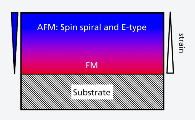 Normally, single crystalline LuMnO3 exhibits an antiferromagnetic order where two spins always point in one and the next two in the opposite direction. In the layers produced and studied at the PSI, instead a ferromagnetic order, where all spins point in the same direction, was observed in the first ten nanometres, i.e. in the direct vicinity of the surface of the carrier crystal. “Normally, you can’t convert an antiferromagnet into a ferromagnet – for reasons of symmetry apart from anything else. Something special must have happened here,” stresses Christof Schneider, one of the researchers involved. The most likely explanation for the effect is that the crystal structure of the material becomes distorted because it adapts to the structure of the carrier crystal. The ferromagnetic order is preferred in the distorted structure. The crystalline structure relaxes somewhat as the distance to the base increases but not completely, meaning that the expected antiferromagnetic order should appear from a certain distance. Instead, an antiferromagnetic spin spiral is observed where the spins are arranged in the form of a spiral staircase.