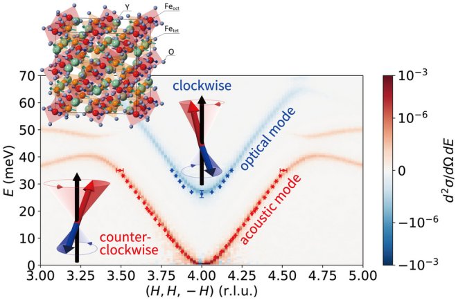In a structurally complex ferrimagnet like YIG, however, something more interesting should happen. Theory has indicated that the magnons propagating through the crystal not only split into two branches with opposite polarisations but are also of different energies – a lower energy ‘acoustic’ mode and a higher energy ‘optical’ mode.