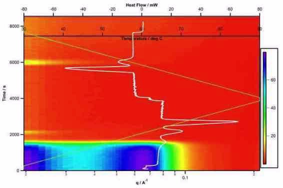 Figure 1 (below) shows the time-evolution of SANS data from a demixed equimolar C30H62:C36D74 mixture during a heating and cooling DSC measurement. Data shown have been radially averaged but not yet corrected for empty crucible background nor blocked beam. DSC data, collected at a ramp rate of 1 K/min are superimposed on the SANS data with time uncertainty of +/- 1 second.