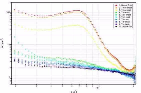 Figure 2 (below) shows binned SANS data collected below, during and following all three transitions on heating. It is apparent that the peak at q = 0.07 Å-1, which is intense at temperatures below the first endotherm, decreases slightly at the onset, by more than 50% at the peak of the endotherm, and is absent thereafter.