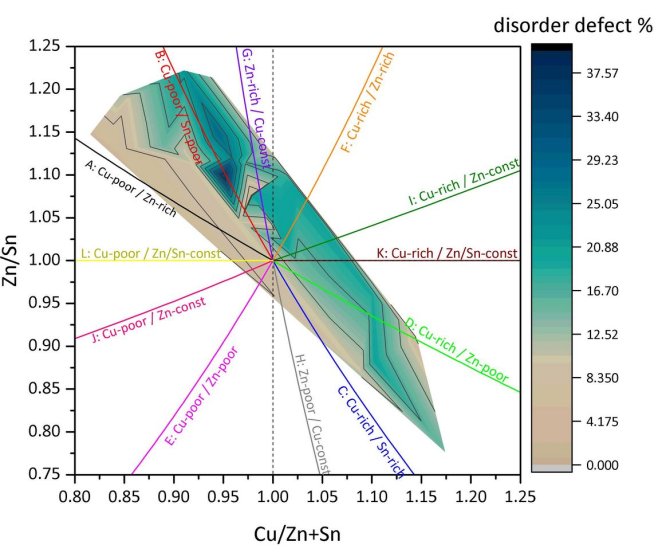 Beside the presence of point defects, which can be explained via stoichiometry deviations, the so called Copper/Zinc disorder plays an important role as well: Disorder means that copper atoms are sitting on Zinc sites in the crystal structure and vice versa. This disorder can be reduced via a heat treatment (annealing), which enhances often the efficiency of CZTSe based solar cells.